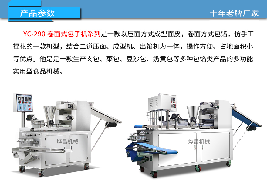 YC-290IIA包子機是一款以壓面方式成型面皮,卷面方式包餡,仿手 工捏花的一款機型,二道壓面、成型機、出餡機為一體,操作方便、占 地面積小等優(yōu)點。