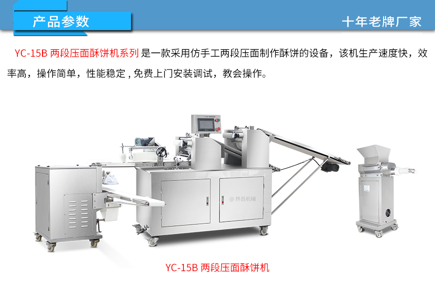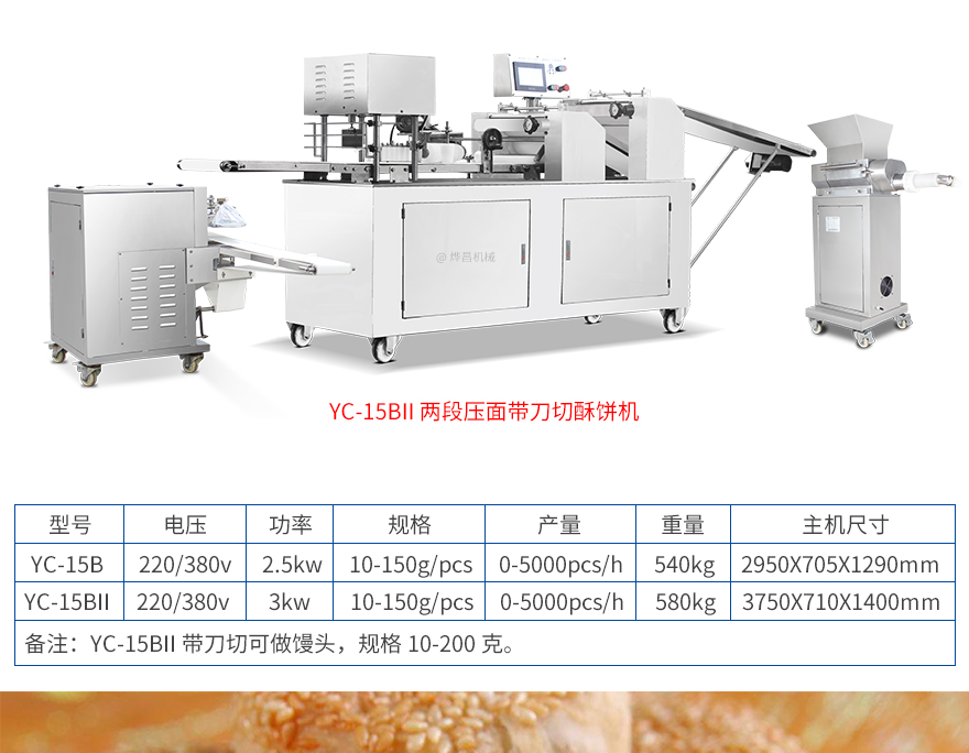 15BII二道壓面帶刀切酥餅機(jī),生產(chǎn)速度快、效率高、生產(chǎn)流程流暢,各環(huán)節(jié)都輔以精密電控設(shè)備控制,不會(huì)出現(xiàn)堵面、破酥等現(xiàn)象?缮a(chǎn)蘇式月餅、肉松餅、老婆餅、廈門餡餅、金華酥餅、拉絲面包等等特色酥餅。