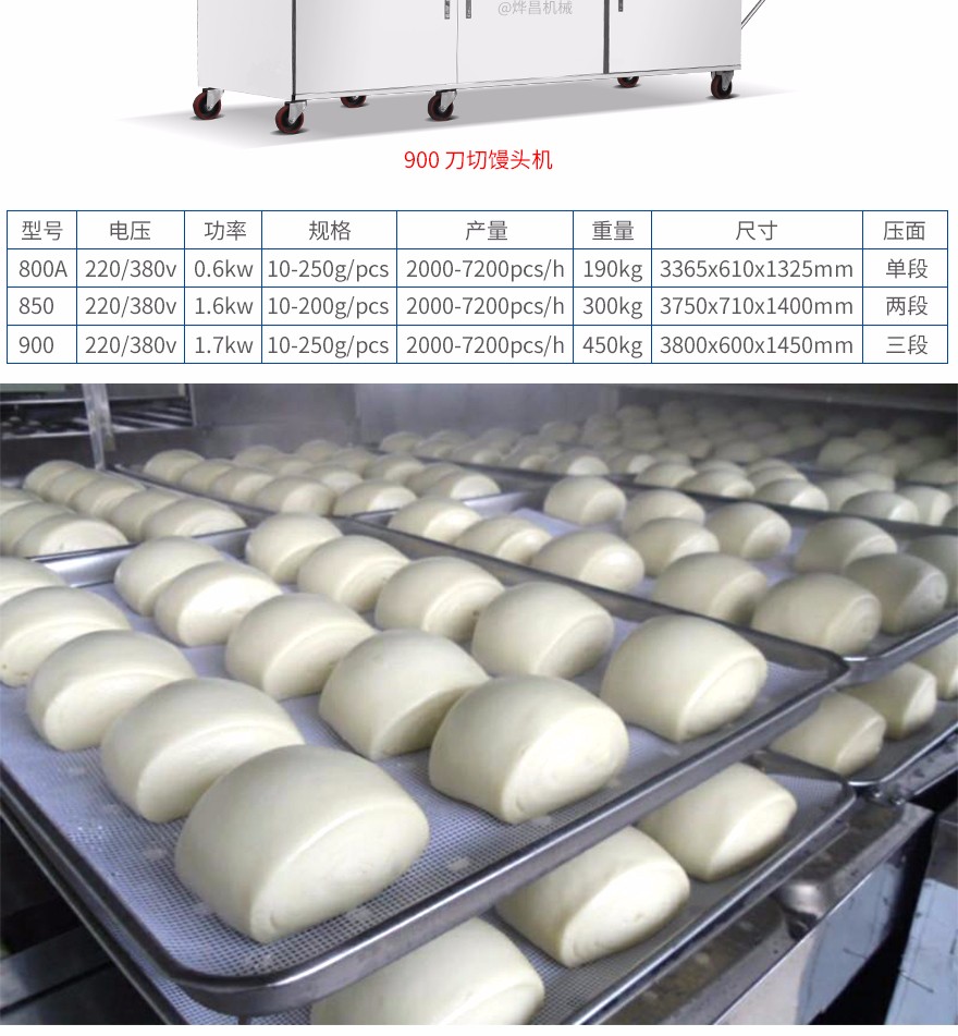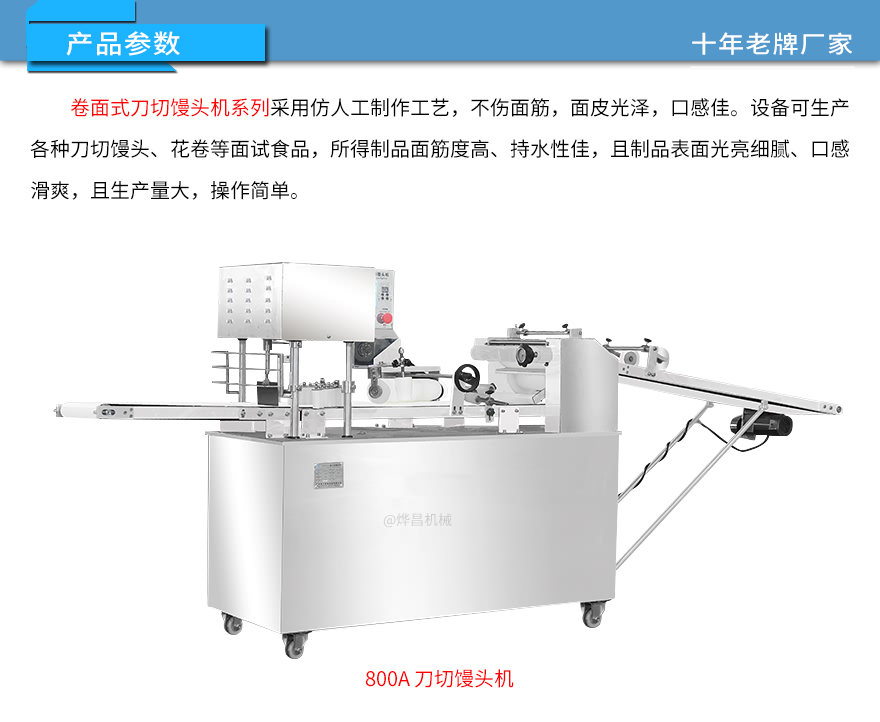 800A型刀切饅頭機采用單段壓面制作工藝,仿人工式卷面,不 傷面筋,面皮光澤,口感佳。設(shè)備可生產(chǎn)各種刀切饅頭、花卷等面試食 品,所得制品面筋度高、持水性極佳,且制品表面光亮細膩、口感滑爽 。